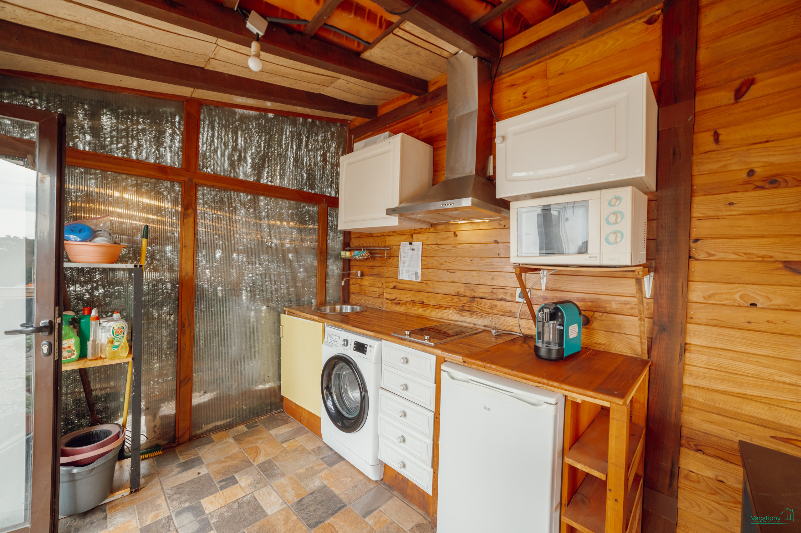 La cuisine, est équipée avec réfrigérateur, micro-ondes, four, congélateur, vaisselle/couverts, ustensiles/cuisine, cafetière, grille pain, bouilloire et presse-agrumes.